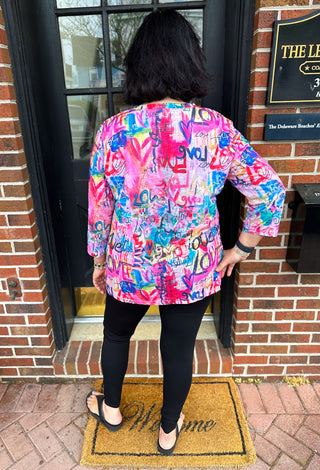 Lulu B Blue Roses Scoop Neck Pocket 3/4 Sleeve Top