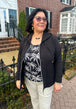 Cat, marketing guru is 5'2" tall and typically wears an XS in all lines at Blooming Boutique. She wears a small in the Lulu B linen jacket. For jeans she wears a 5 or 26. For skinny jeans, she wears a 27.