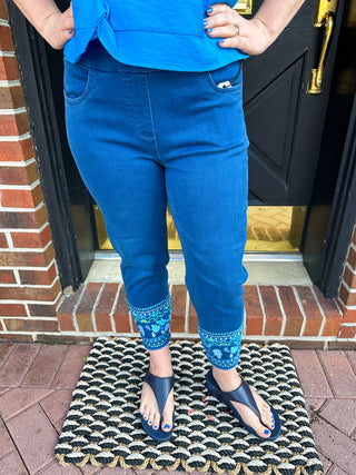Lulu B Dark Denim Leaves Embroidered Capri – Blooming Boutique