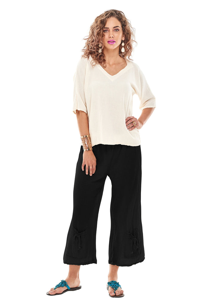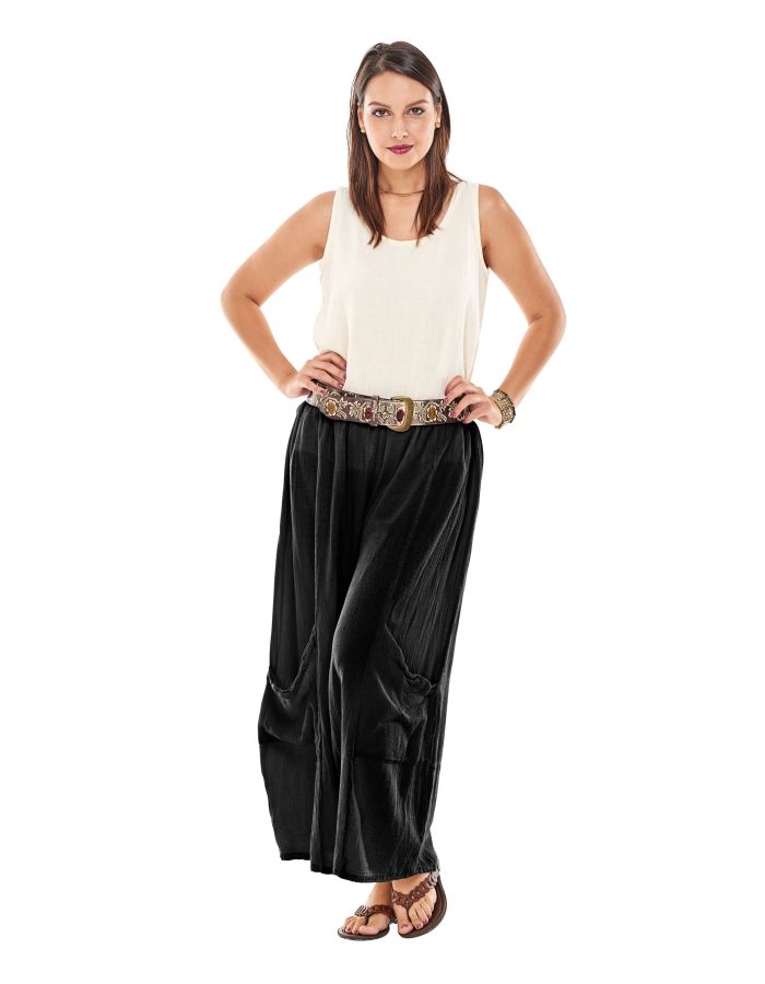 Oh My Gauze offers a wide variety of gauze bottom options including shorts, capris, and full-length pants. Many styles do not include pockets so that no added "bulk" is added to the easy gauze looks. The Fiona and Basic styles both have front pockets. All gauze bottoms feature elastic, pull-on waistbands.