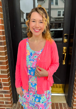 This coral cotton cardigan is sure to be one of your new favorite layering pieces.
