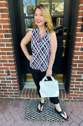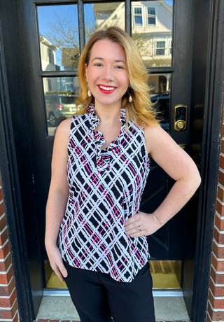 Beachtime by Lulu B Little Ruffle Neck Sleeveless Top Black Abstract