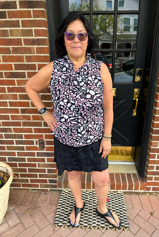 Beachtime by Lulu B Ruffle Neck Sleeveless Top Black and Stone Palms