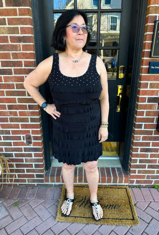 The Tango Mango Black Sparkle Cha Cha Dress brings a touch of glam to a playful silhouette, featuring soft tiered ruffles and a scoop neckline embellished with shimmering studs. Perfect for evenings out or special occasions, this dress moves beautifully and catches the light with every step.