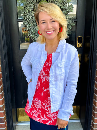 Cat, marketing guru is 5'2" tall and typically wears an XS in all lines at Blooming Boutique. She wears a small in the Lulu B linen jacket. For jeans she wears a 5 or 26. For skinny jeans, she wears a 27.