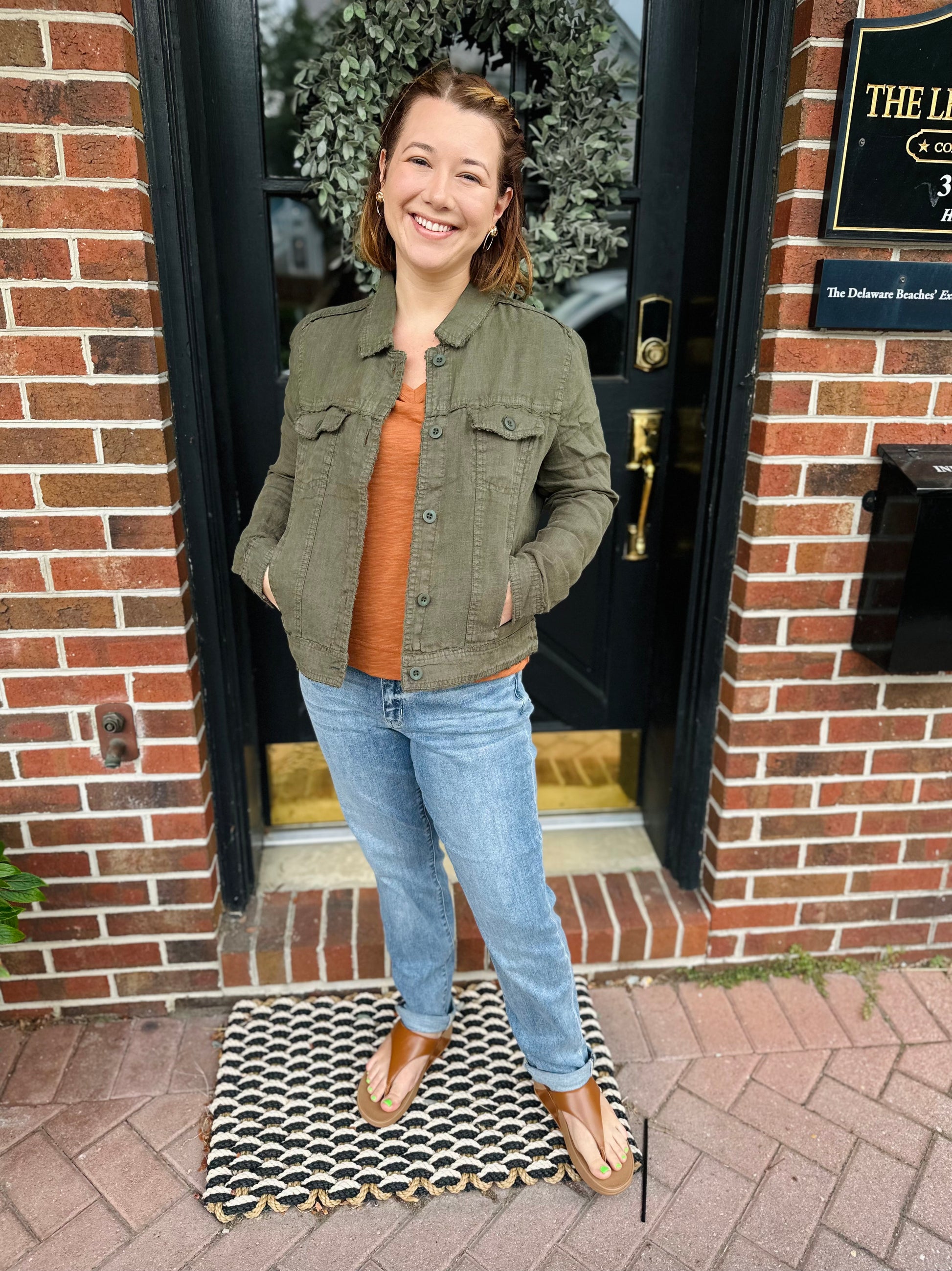 Cat, marketing guru is 5'2" tall and typically wears an XS in all lines at Blooming Boutique. She wears a small in the Lulu B linen jacket. For jeans she wears a 5 or 26. For skinny jeans, she wears a 27.