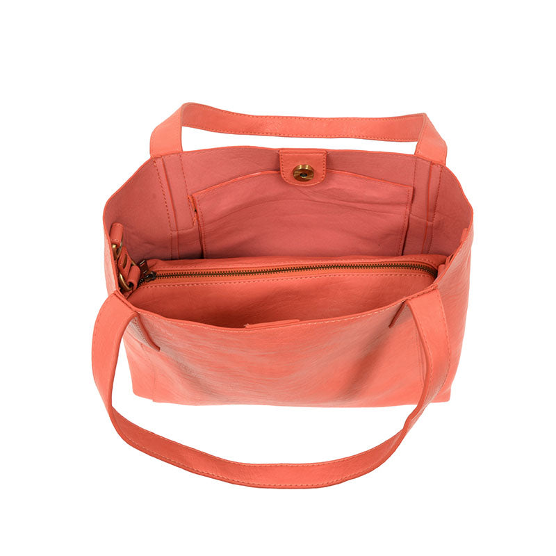 Two great bags in one! The Lottie is a medium sized tote with a modern east west shape in gorgeous Buffalo grain vegan leather with a bonus interior bag that can be used as a storage pouch inside the tote or taken out and worn on its own as a crossbody bag with the included crossbody shoulder strap. Either way this bag is a great value with chic style!