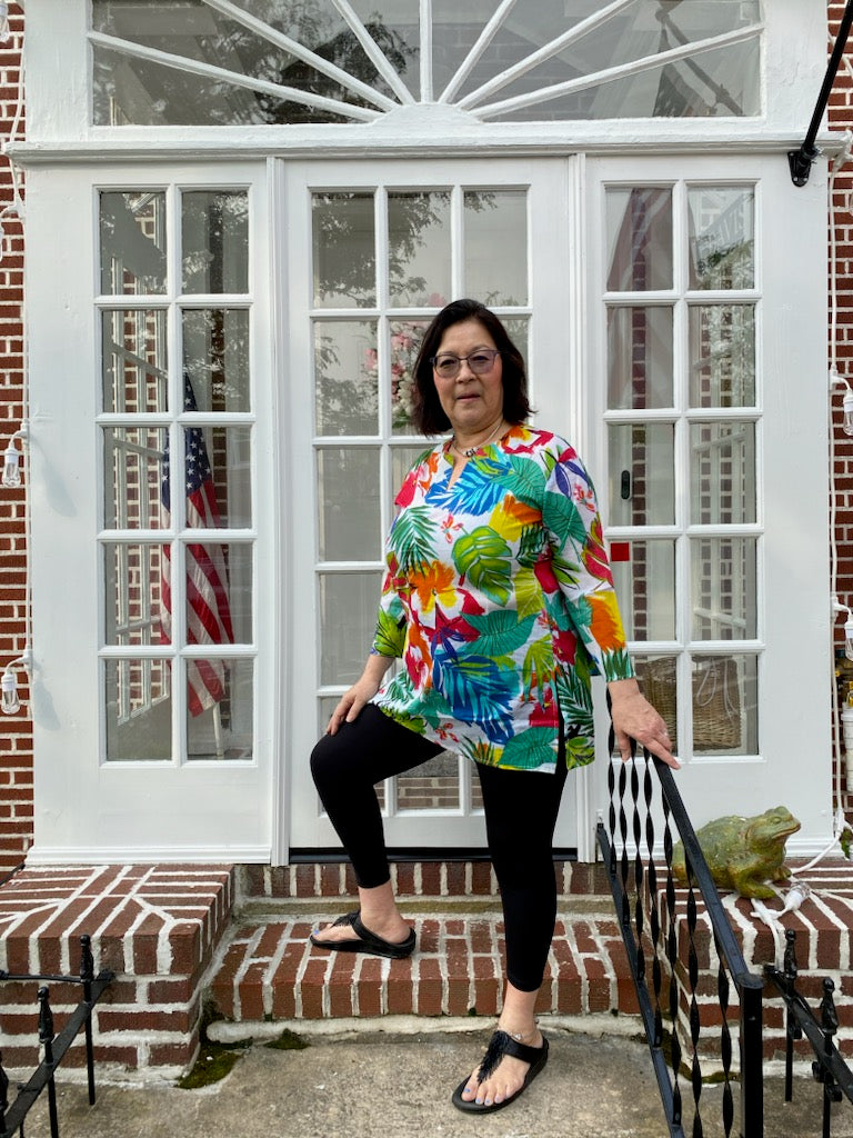 Micha is 5' 8" and wearing her true size XL in this tunic. If you have a large bust, we recommend sizing up in this tunic as there is no stretch to the fabric.