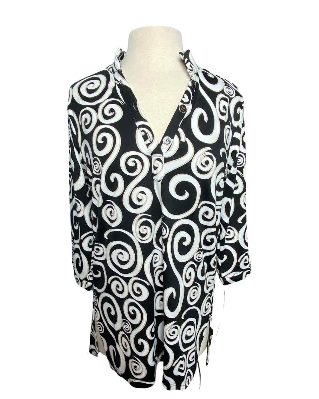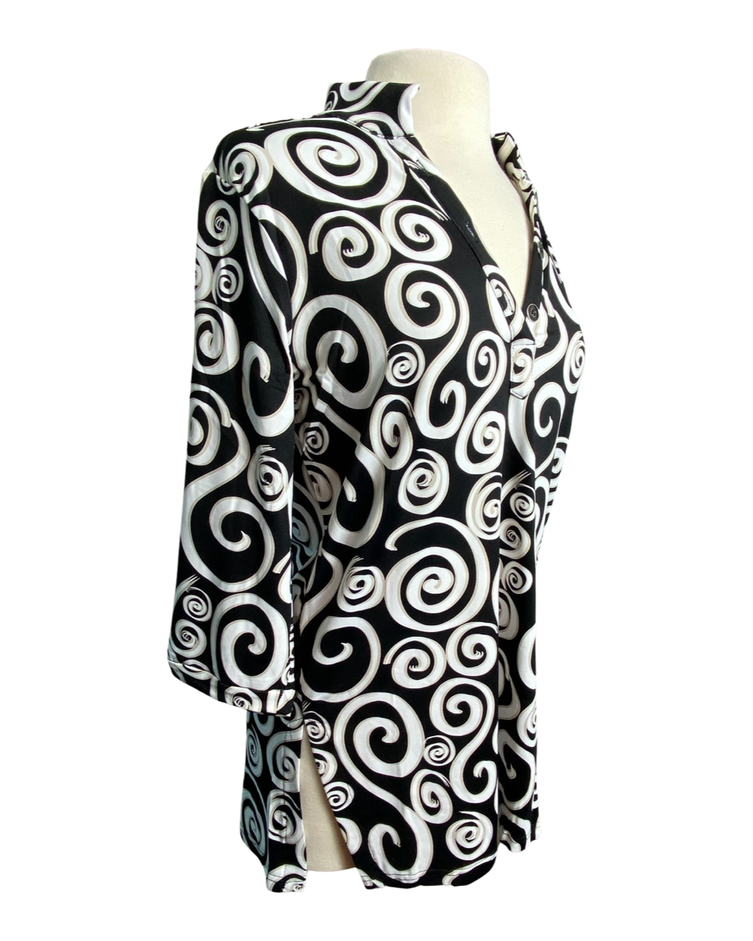 This gorgeous tunic looks great with black leggings. The gold in the swirls pairs perfectly with gold accented accessories too. Made from SPX fabric, the material is stretchy and moisture wicking as well as sun protective! Side slits are perfect for providing a little extra room for hips and butt!