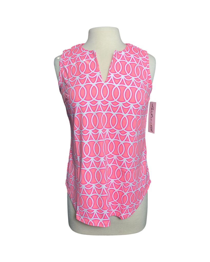 This top is a versatile piece that is perfect for work or going out. It is available in many solid colors and prints too. The circles print from Lulu B features a pink and white design of overlapping circles.