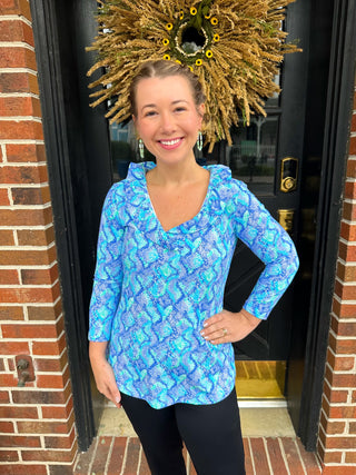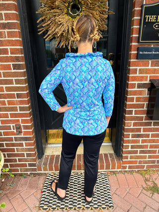 A fun 3/4 sleeve, ruffle neck top that pairs beautifully with slacks, jeans, or even skorts.