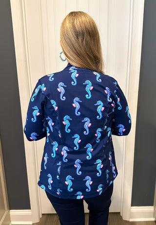 This easy jacket features a full-zip, high-neckline. Long sleeves provide SPF protection making it the perfect piece for a breezy day on the boat!
