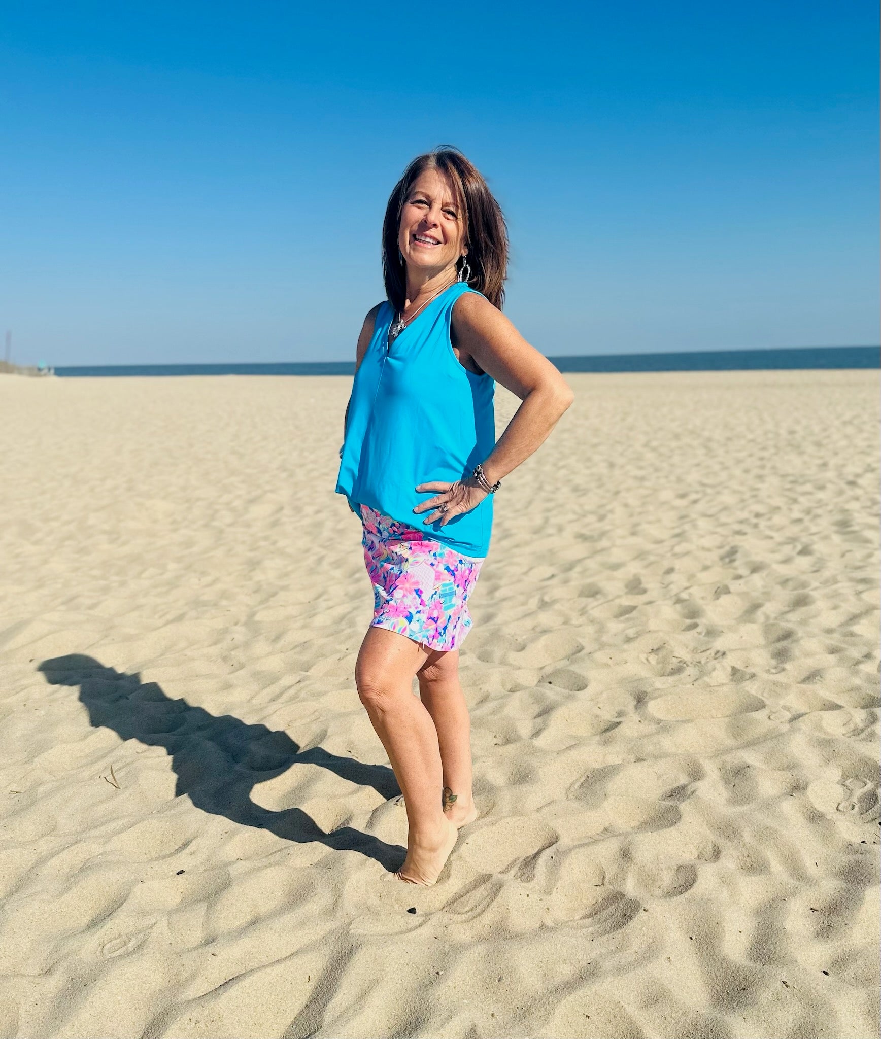 This sleeveless top is so versatile!  Available in many colors, it pairs beautifully with your favorite capris or skorts for summer, and is a great layering piece during the spring, fall and winter times! Clear turquoise is a fun and vibrant color that looks beautiful with many Lulu B prints.