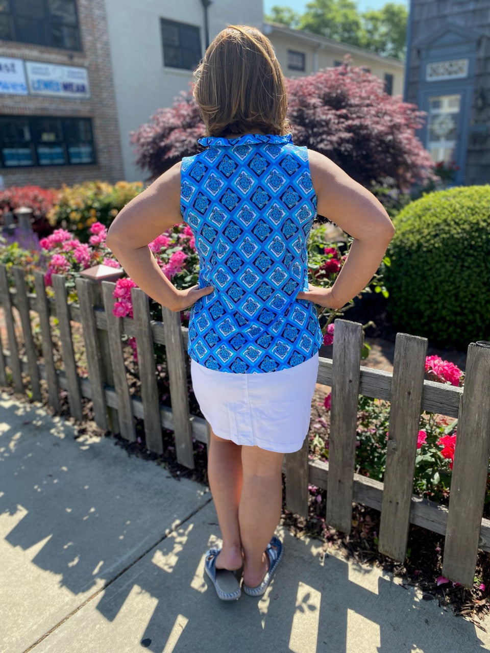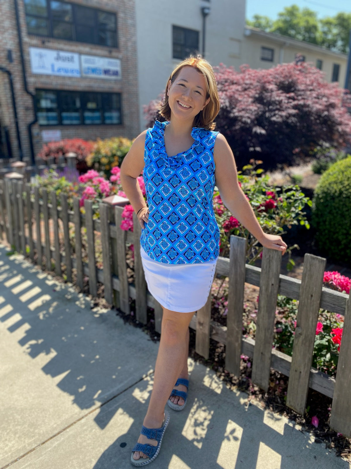 This v-neck, ruffle collar, sleeveless top pairs beautifully with skorts, shorts, or slacks. This top is great for work or going out and pairs beautifully with a cardigan too.