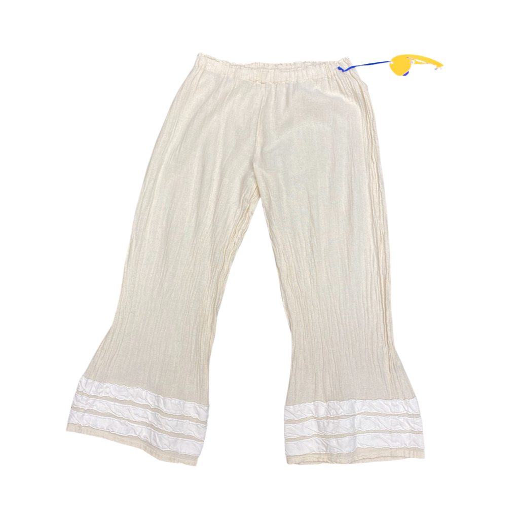 A wide legged cropped cotton gauze pant with striped applique detail at the hemline.