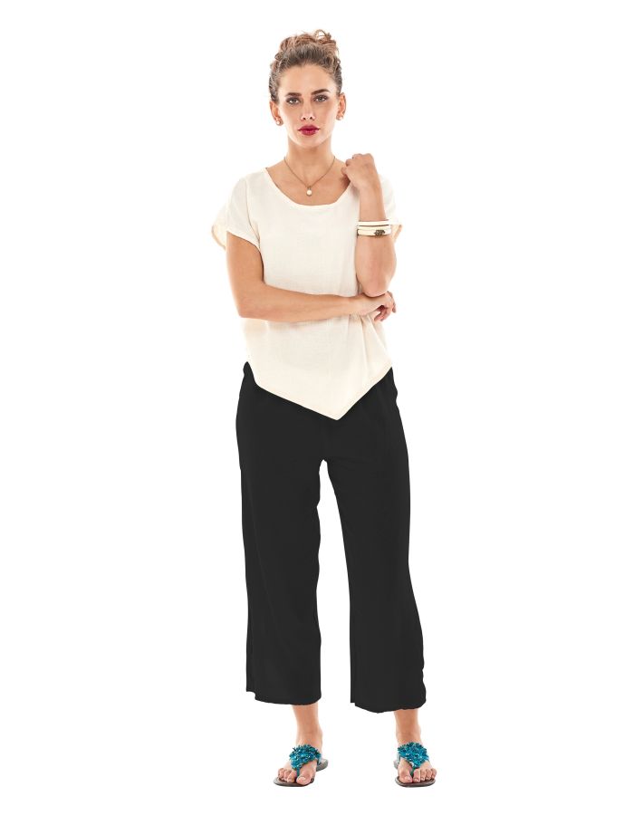 A shorter length cotton gauze pant with a slender fit having two hole detail near the bottom outside.