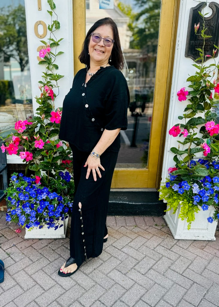 A flare leg, full length cotton gauze pant with angular button detail on the front panel.