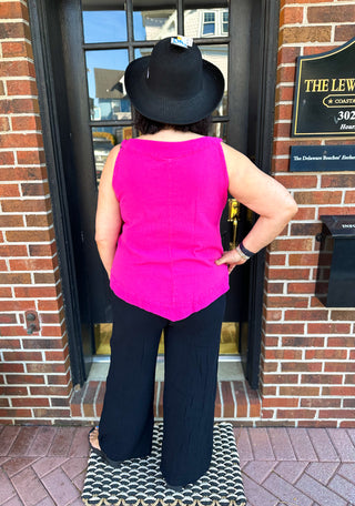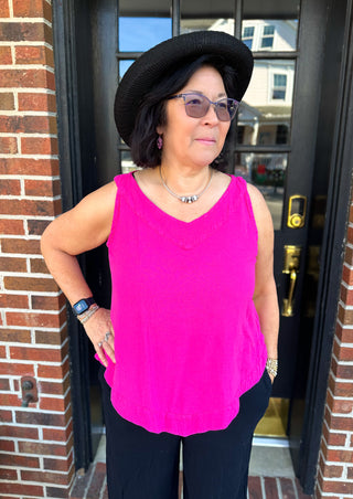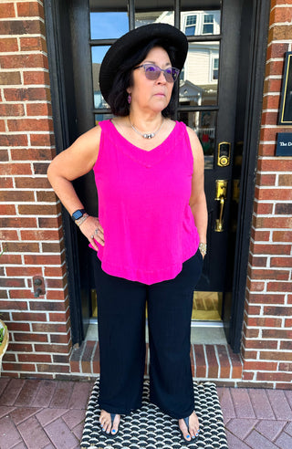 A sleeveless V-neck cotton gauze top with delicate point detail at the hemline.
