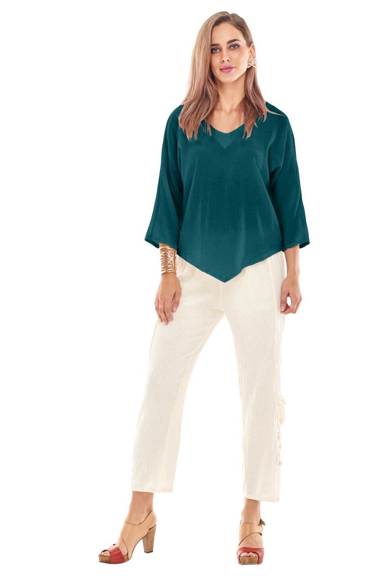 Elevate your everyday style with our exquisite Oh My Gauze Lynn Pine Top. Designed for ultimate comfort and effortless chic, this versatile top features a flattering V-neckline that beautifully frames the décolletage, alongside comfortable 3/4 sleeves perfect for any season. The rich, vibrant teal color adds a sophisticated pop to your wardrobe, making it an instant favorite for both casual outings and more dressed-up occasions. Crafted from a soft, breathable fabric, this tunic top promises all-day comfort without compromising on style. Its distinctive asymmetrical hemline adds a modern, fashion-forward touch, creating a dynamic silhouette that pairs wonderfully with everything from skinny jeans and leggings to flowing skirts. Embrace a look that's both relaxed and refined, suitable for a bustling day or a tranquil evening out.