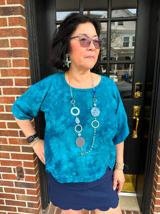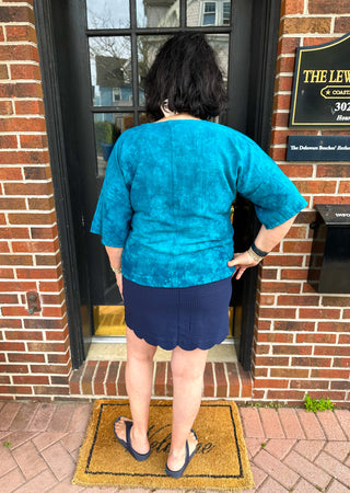 A cotton gauze blouse with a scallop hemline. The Scallop Top in Washed Peacock is a must-have for its fun and tie dye teal hue that radiates confidence. Perfect for adding a pop of color to your wardrobe, this striking shade enhances the elegant scallop hemline, making it a standout piece for any occasion.