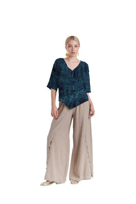 A half sleeve cotton gauze top with a short V-neck and front detail stitching. The Tiny Blouse in Washed Sapphire is a must-have for its tie-dye navy hue that brings a serene and uplifting touch to any wardrobe. The combination of its soft color, breathable cotton gauze fabric, and stylish details like the short V-neck and front stitching makes it a versatile piece perfect for effortlessly chic looks.
