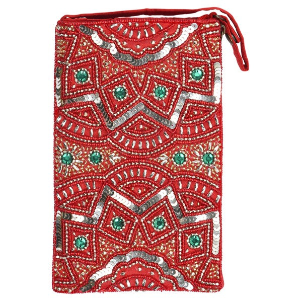 Hand beaded by artisans in India, this versatile smart phone bag can be worn cross body or as a wristlet.