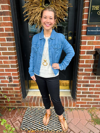 Cat, marketing guru is 5'2" tall and typically wears an XS in all lines at Blooming Boutique. She wears a small in the Lulu B linen jacket. For jeans she wears a 5 or 26. For skinny jeans, she wears a 27.