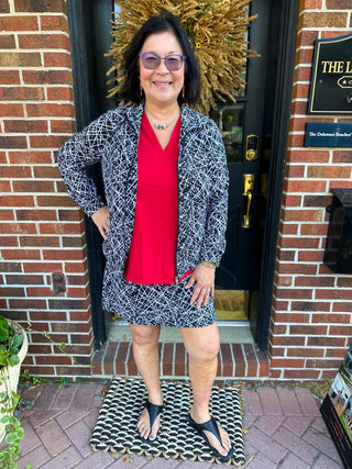 Cat, marketing guru is 5'2" tall and typically wears an XS in all lines at Blooming Boutique. She wears a small in the Lulu B linen jacket. For jeans she wears a 5 or 26. For skinny jeans, she wears a 27.