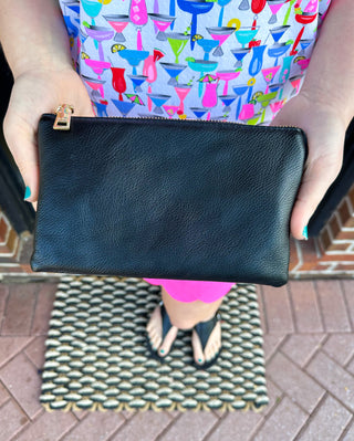 This crossbody/clutch has two major compartments with one middle zipper pocket and a top zipper closure. Inside are two slip pockets and six cardholders. Wear it as a crossbody or use it as a clutch! Includes a detachable wristlet strap and an adjustable shoulder strap. Made of vegan leather. Dimensions: 8"L x 1.5"D x 5"H