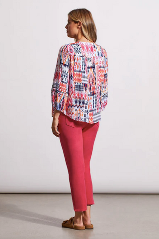 Steal the spotlight in this button-up blouse cut from challis fabric with a color-packed pattern. We're head over heels for the flowy fit, three-quarter sleeves, elastic cuffs, dainty shell buttons, and decorative pleats.